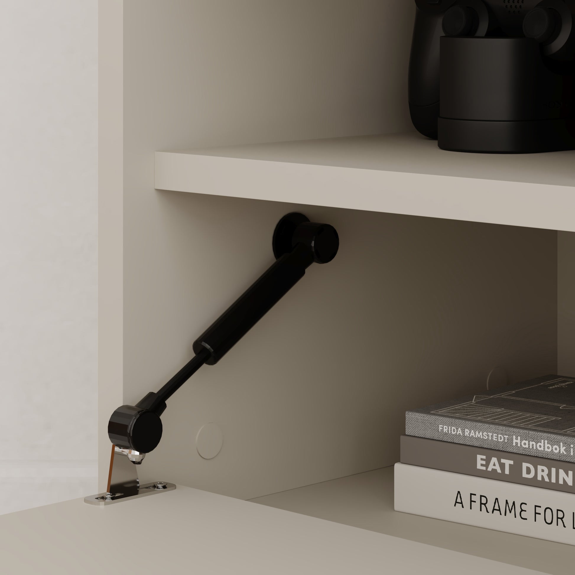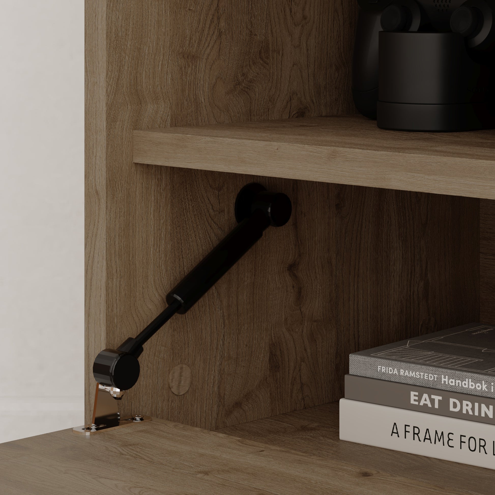 Functional storage – open shelves for media devices, plus a drop-down cabinet for hidden storage.