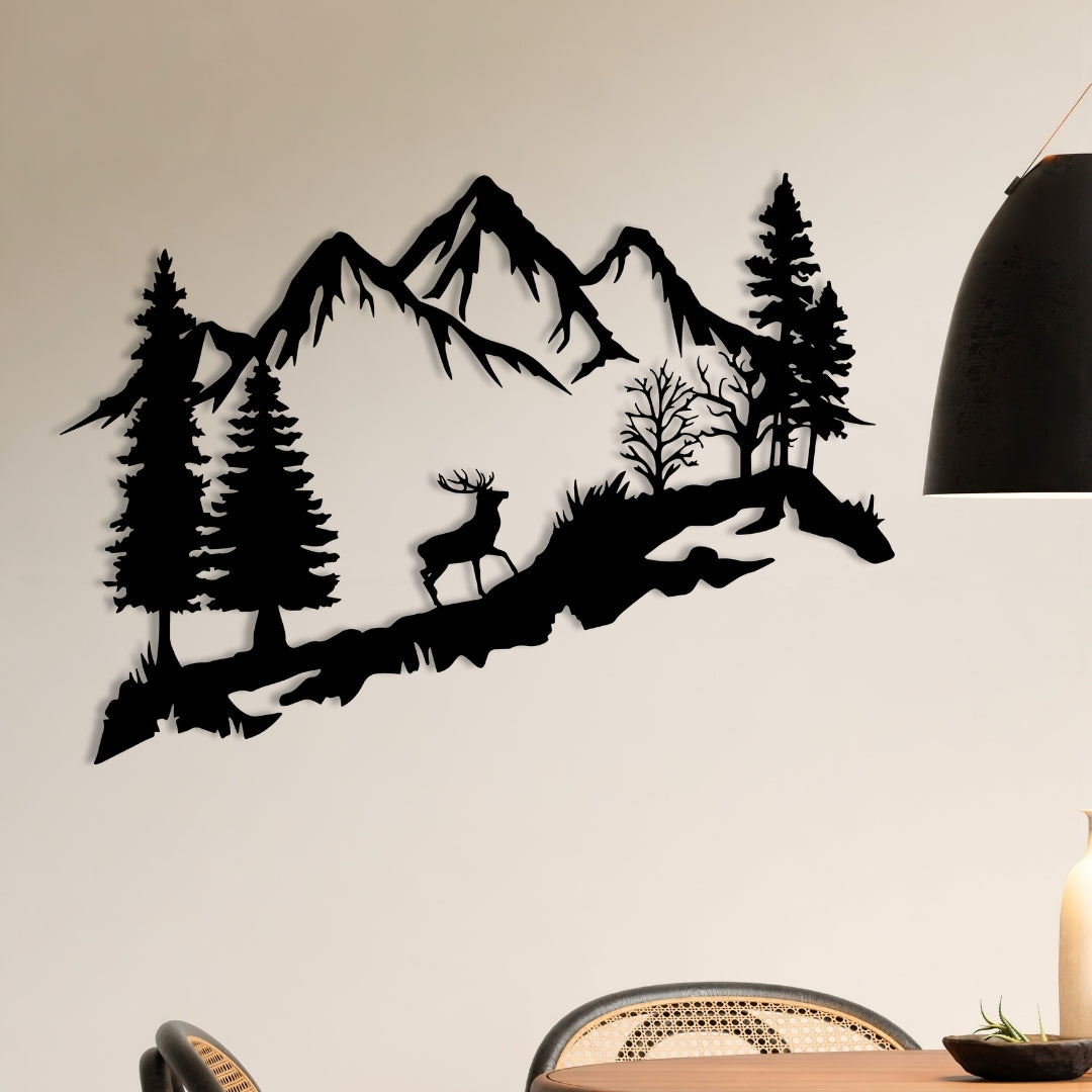Mountain Deer Metal Wall Art – 3D Nature Scene with Trees & Mountains | 3 Sizes