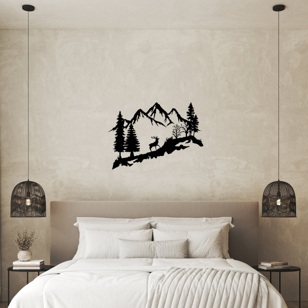 Expertly crafted from static dyed iron, this nature-inspired piece features a detailed mountain landscape with pine trees, rugged terrain, and a majestic deer. Available in three sizes—90x64 cm, 75x53 cm, and 60x43 cm—this design adds depth and personality to any wall.