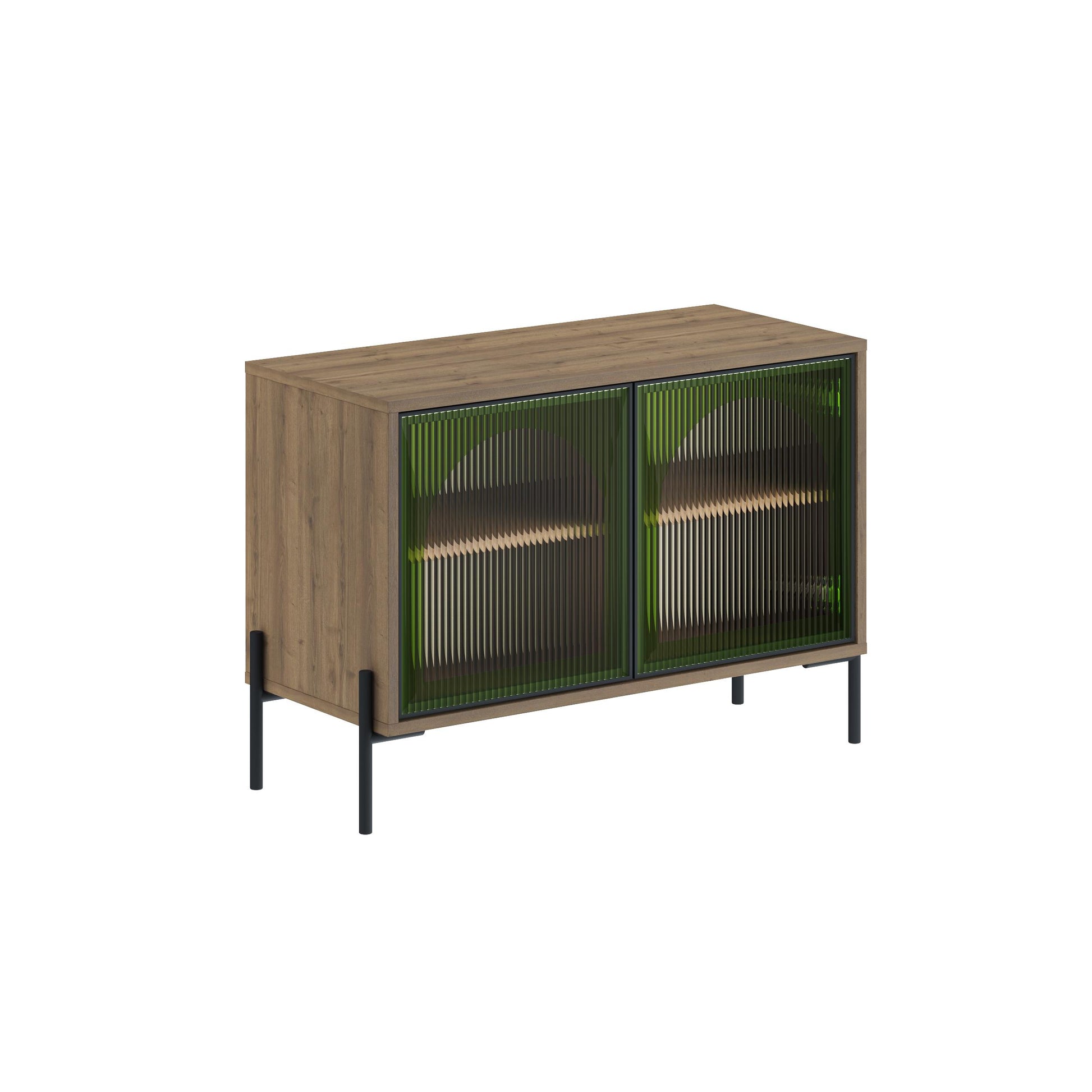 Robinson Sideboard with Fluted Glass Doors with Green Details – Modern Dark Oak Storage Cabinet with Metal Legs